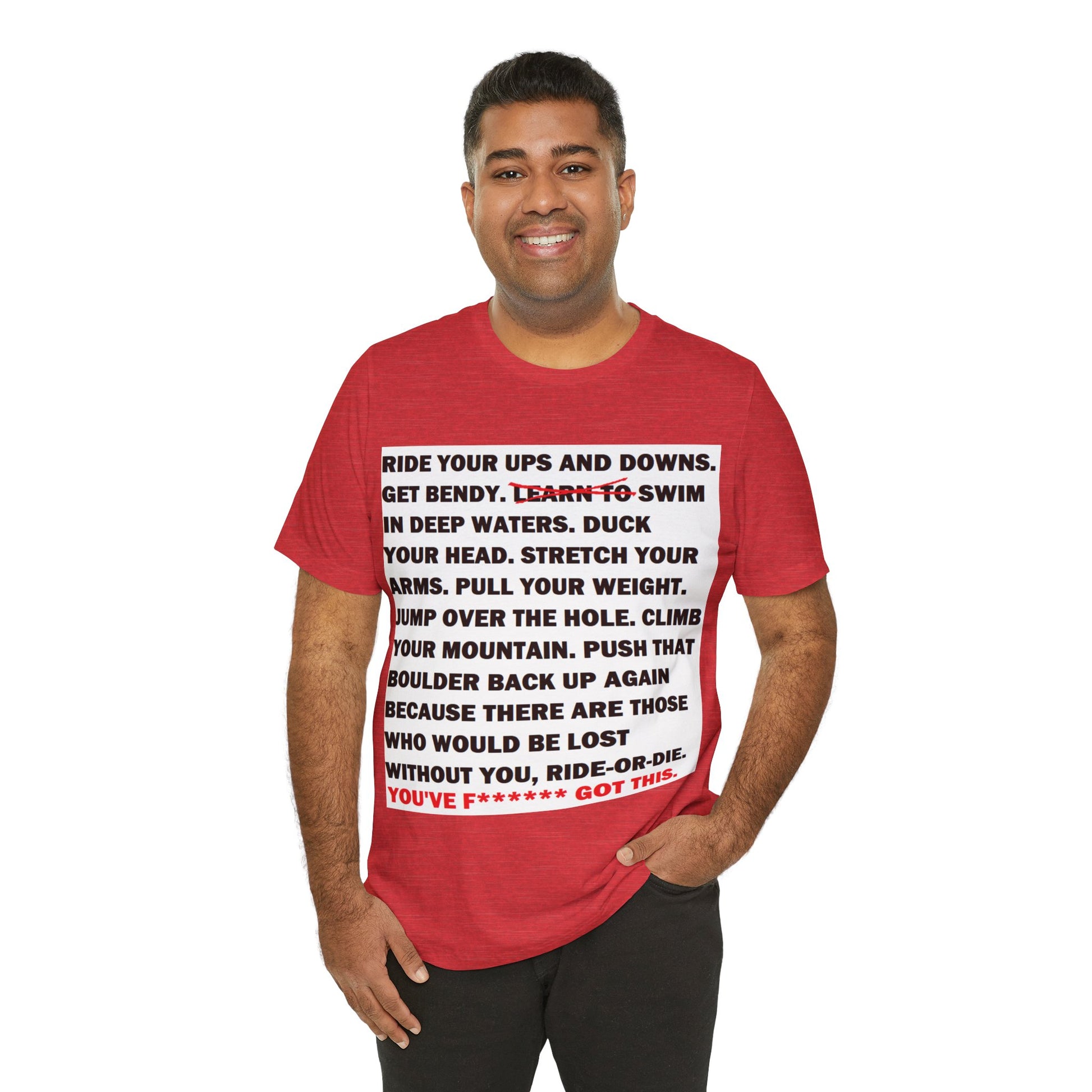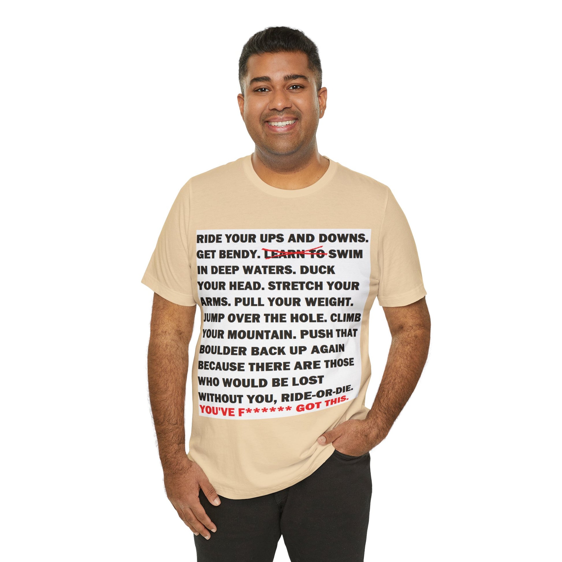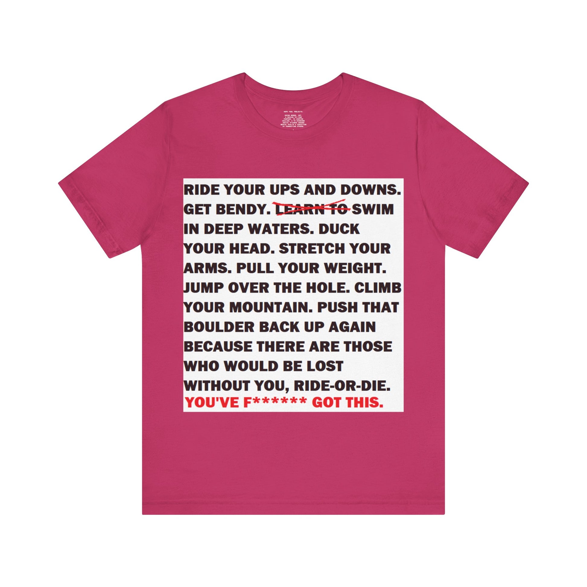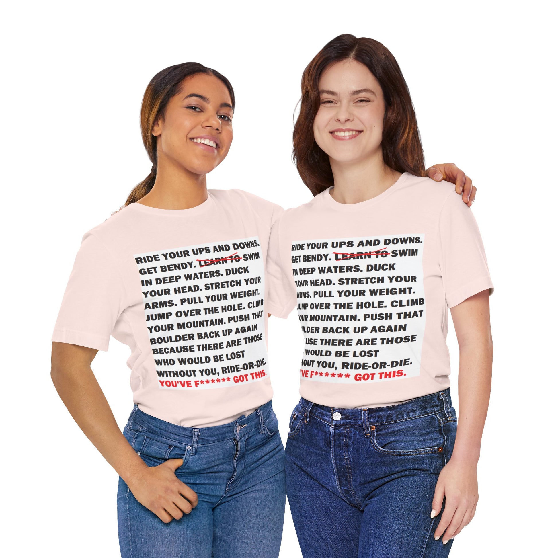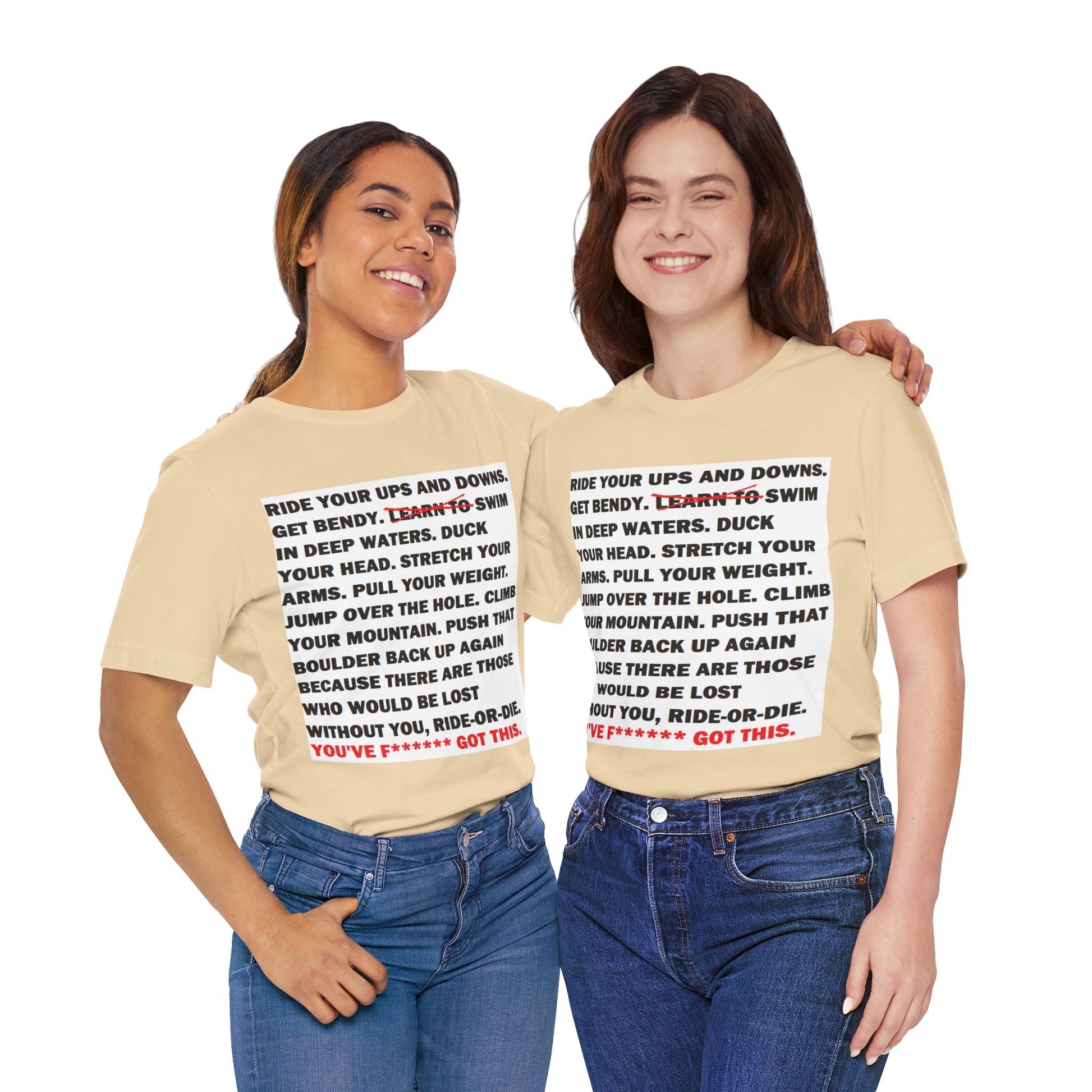 Ride Or Die Motivational Messaging Variants are in Pink, Red, Cream, Yellow, Orange, and Brown "YOU'VE F****** GOT THIS." Unisex Jersey Short Sleeve Tee (Color Group 2of4)