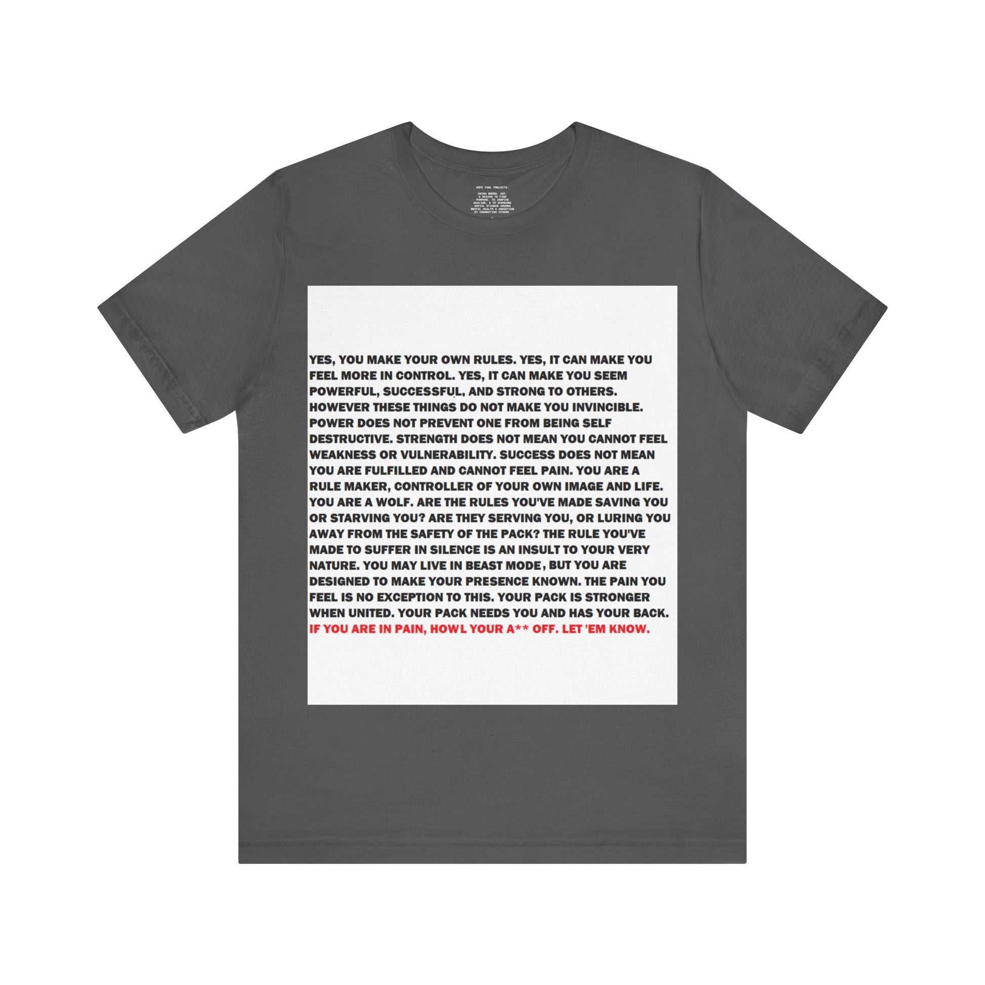Rule Maker Motivational Messaging Variants are White, Grey, Black "IF YOU ARE IN PAIN, HOWL YOUR A** OFF. LET 'EM KNOW." Unisex Jersey Short Sleeve Tee (Color Group 1of4)
