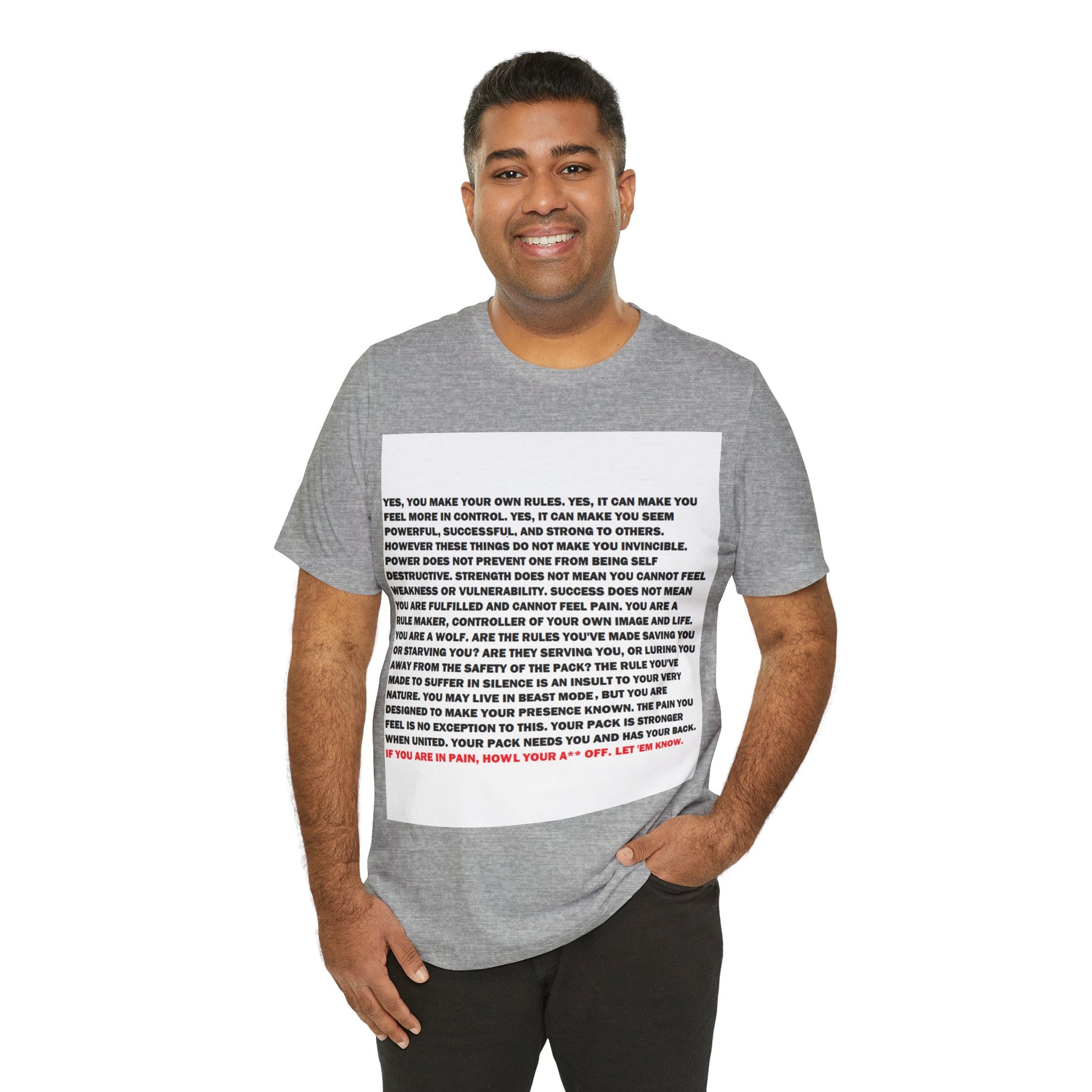 "YES, YOU MAKE YOUR OWN RULES. YES, IT CAN MAKE YOU FEEL MORE IN CONTROL. YES, IT CAN MAKE YOU SEEM POWERFUL, SUCCESSFUL, AND STRONG TO OTHERS. HOWEVER, THESE THINGS DO NOT MAKE YOU INVINCIBLE. POWER DOES NOT PREVENT ONE FROM BEING SELF DESTRUCTIVE. STRENGTH DOES NOT MEAN YOU CANNOT FEEL WEAKNESS OR VULNERABILITY. SUCCESS DOES NOT MEAN YOU ARE FULFILLED AND CANNOT FEEL PAIN. YOU ARE A RULE MAKER, CONTROLLER OF YOUR OWN IMAGE AND LIFE. ARE THEY RULES YOU'VE MADE SAVING YOU OR STARVING YOU? ARE THEY SERVING YOU, OR LURING YOU AWAY FROM THE SAFETY OF THE PACK? THE RULE YOU'VE MADE TO SUFFER IN SILENCE IS AN INSULT TO YOUR VERY NATURE. YOU MAY LIVE IN BEAST MODE, BUT YOU ARE DESIGNED TO MAKE YOUR PRESENCE KNOWN. THE PAIN YOU FEEL IS NO EXCEPTION TO THIS. YOUR PACK IS STRONGER WHEN UNITED. YOUR PACK NEEDS YOU AND HAS YOUR BACK. IF YOU ARE IN PAIN, HOWL YOUR A** OFF. LET 'EM KNOW."