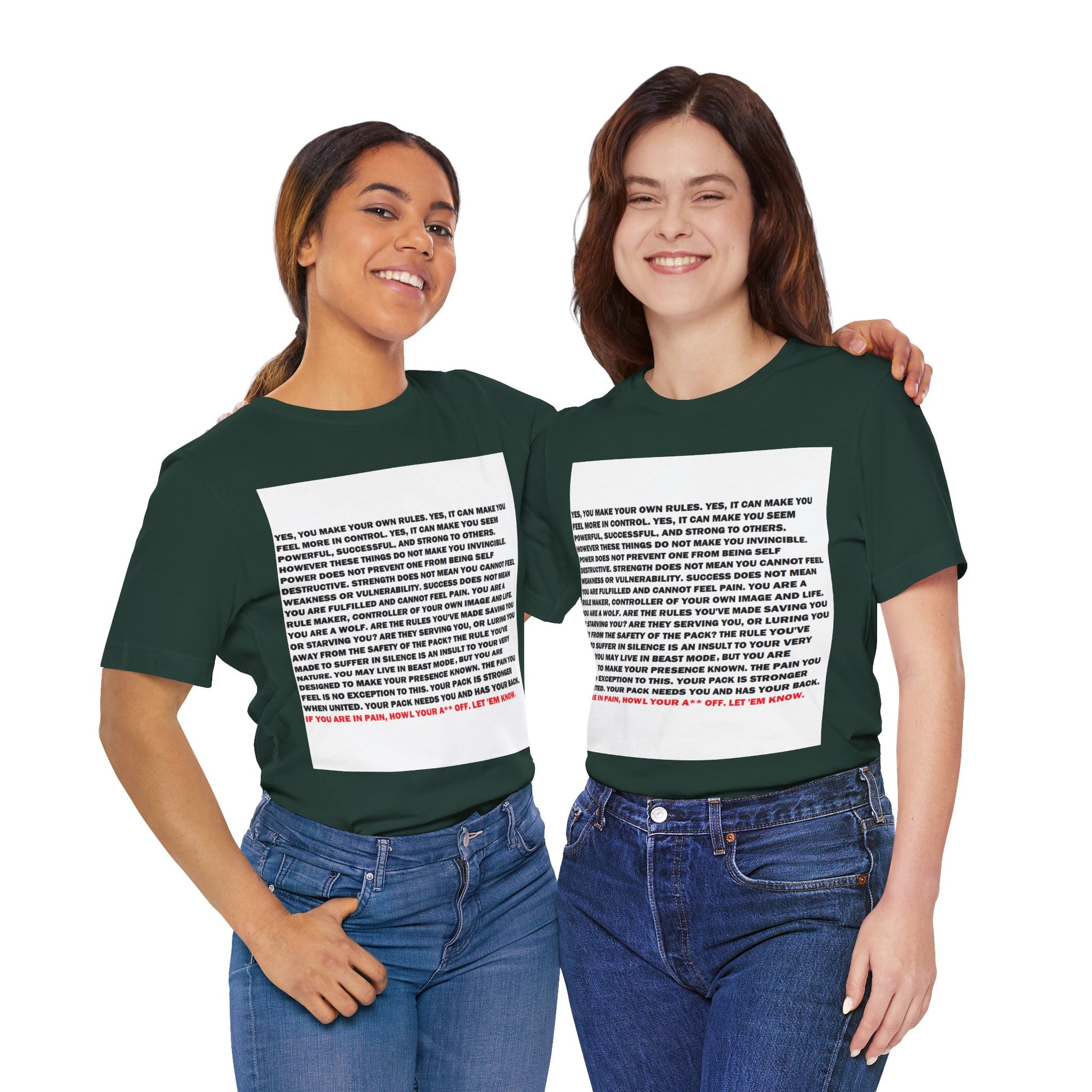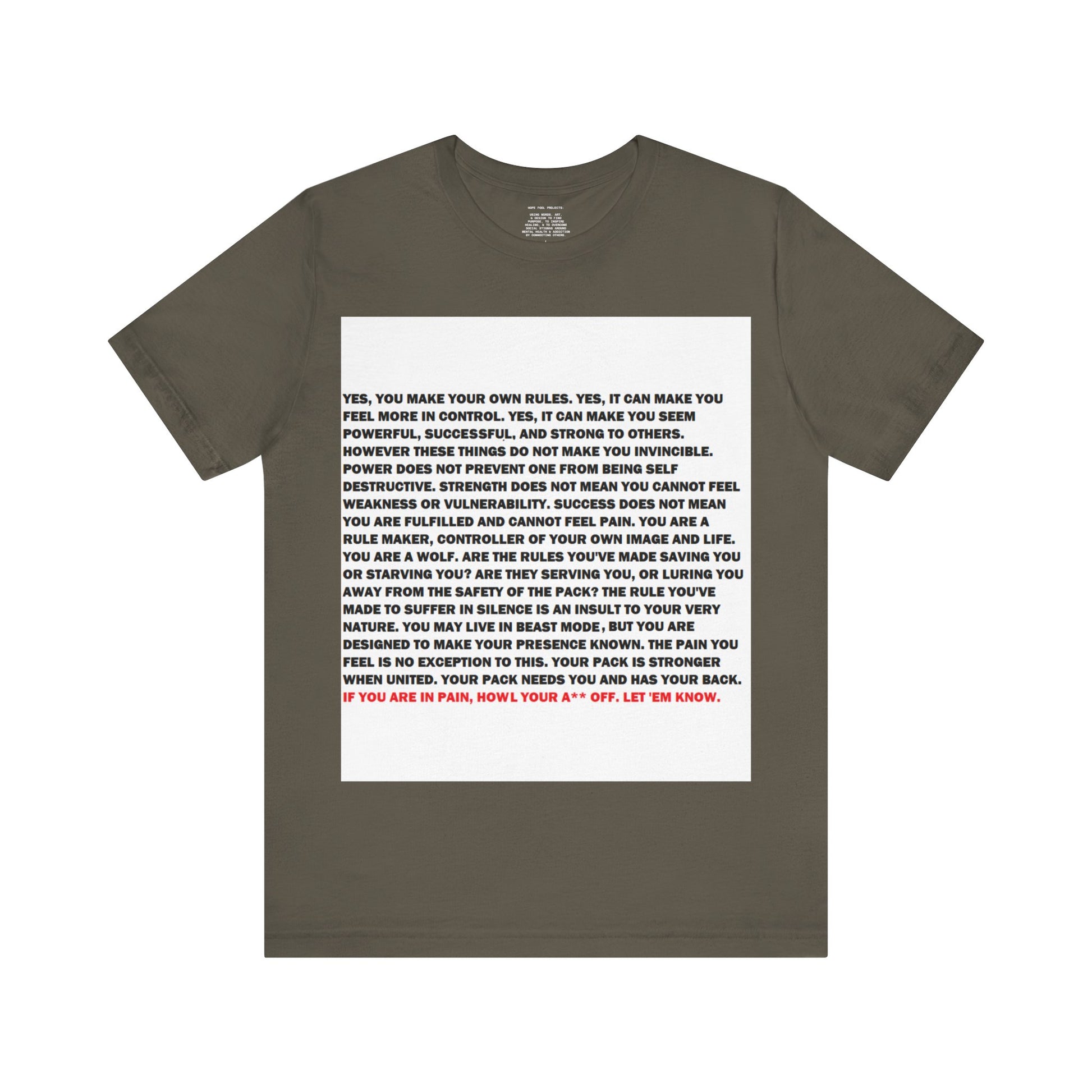 Rule Maker Motivational Messaging Variants of Green "IF YOU ARE IN PAIN, HOWL YOUR A** OFF. LET 'EM KNOW." Unisex Jersey Short Sleeve Tee (Color Group 3of4)