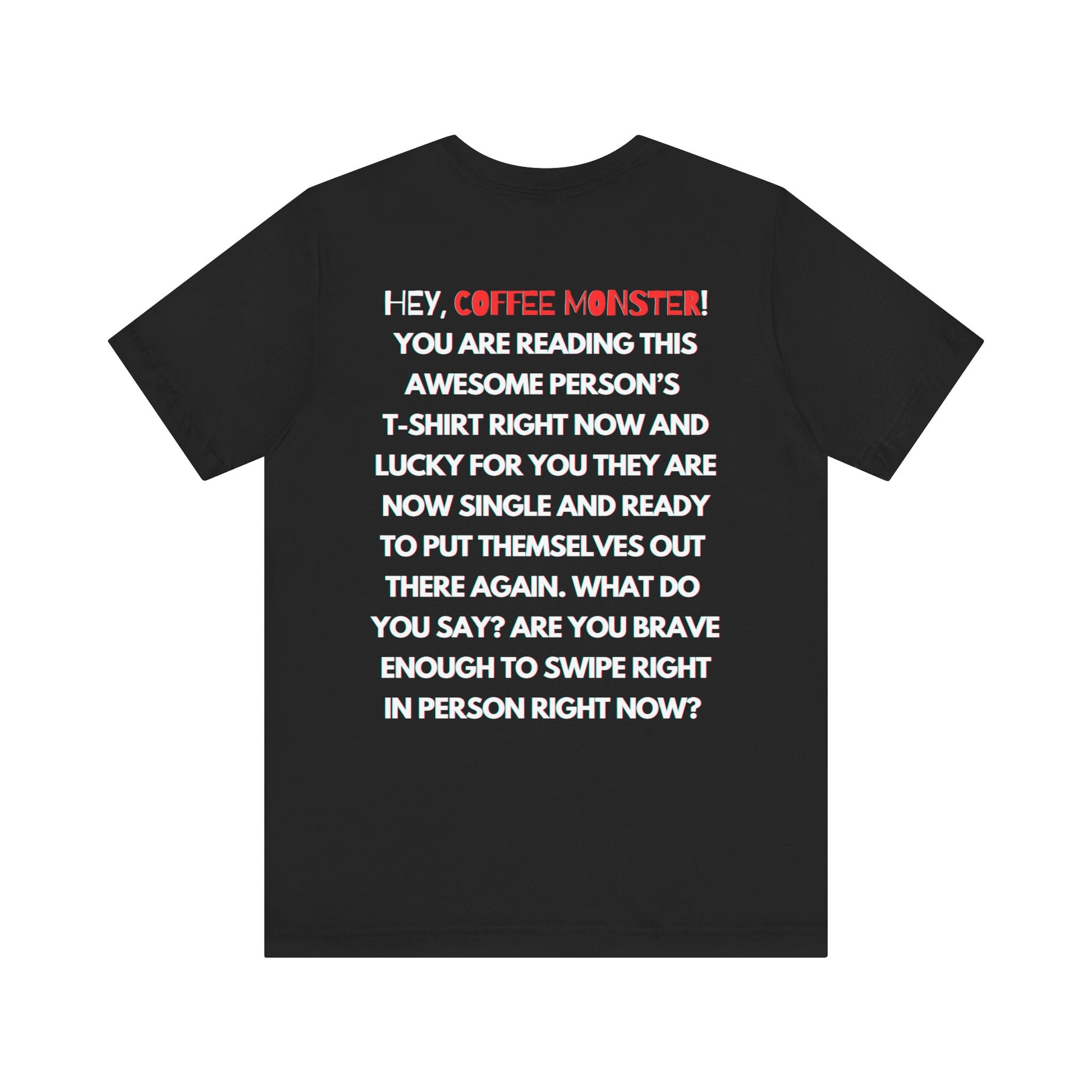 "Single now.... Are you brave enough to swipe right in person?" -Rizz ( Coffee ) Monster Unisex Jersey Short Sleeve Tee