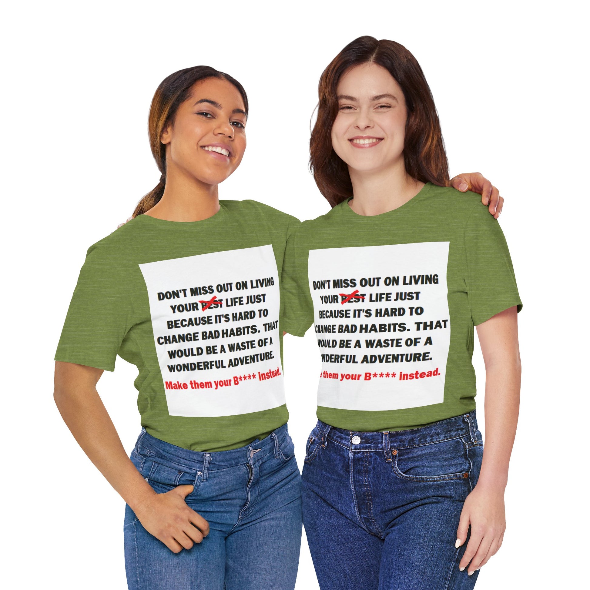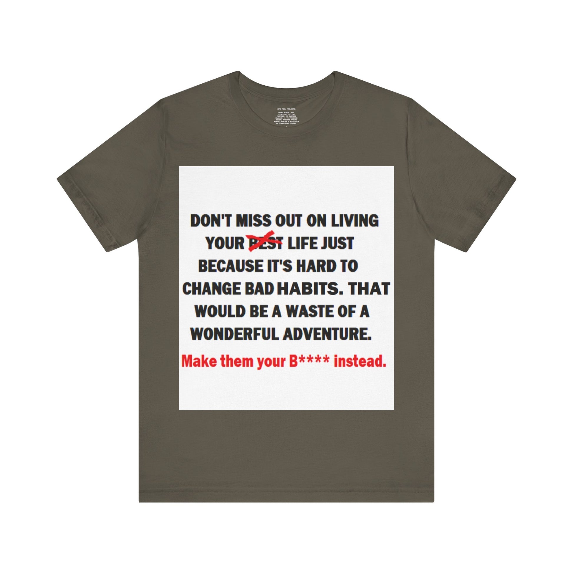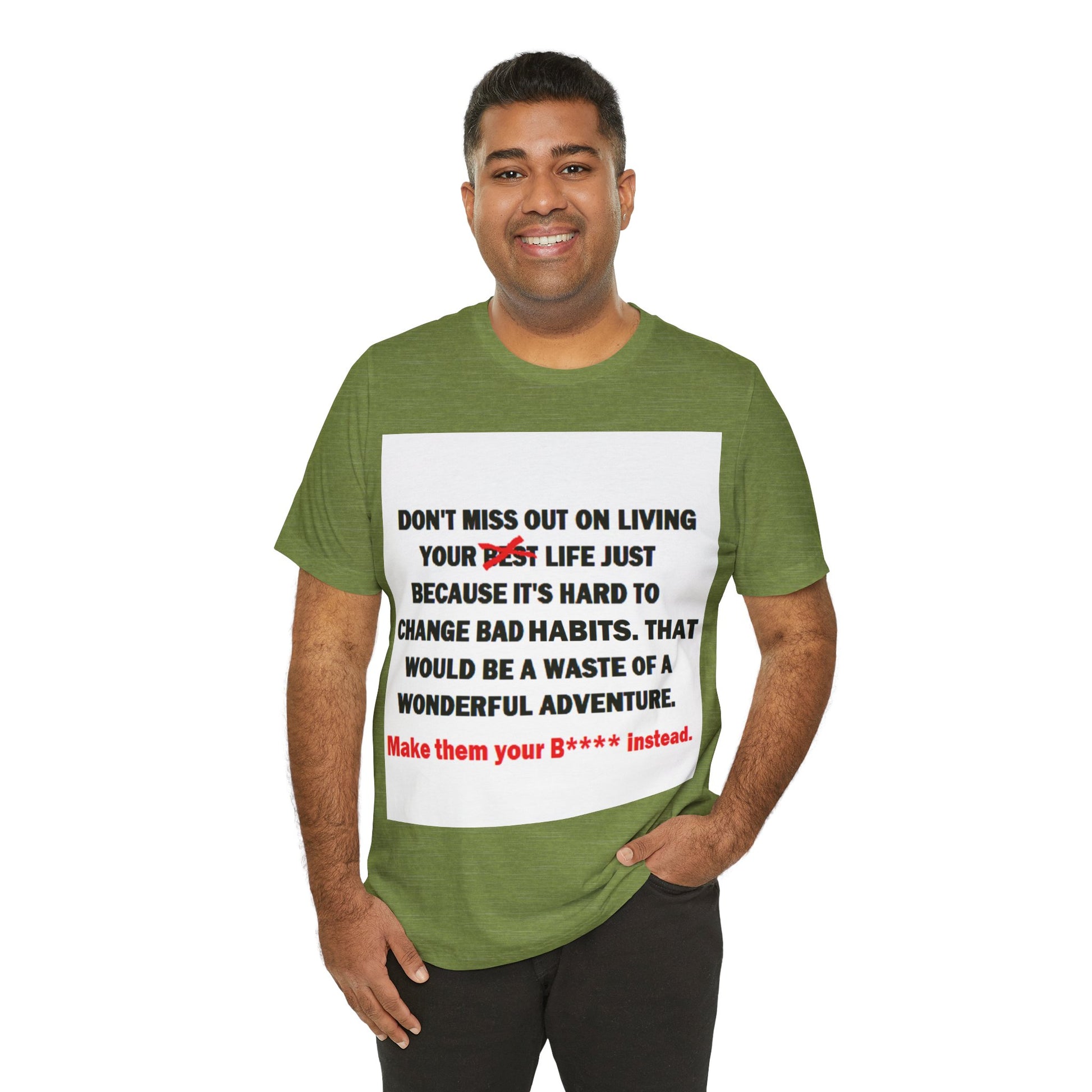 "DON'T MISS OUT ON LIVING YOUR BEST LIFE JUST BECAUSE IT'S HARD TO CHANGE BAD HABITS. THAT WOULD BE A WASTE OF A WONDERFUL ADVENTURE. Make them your B**** instead."