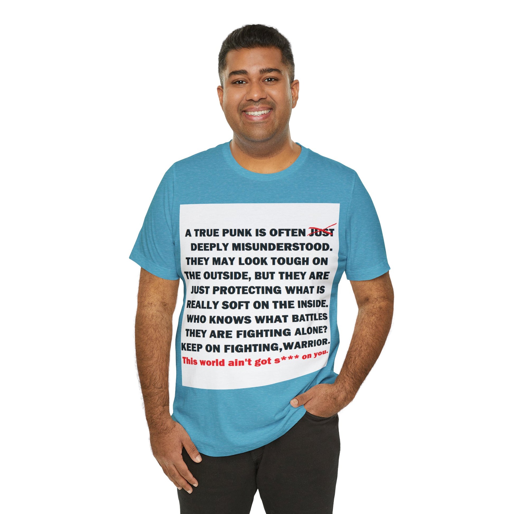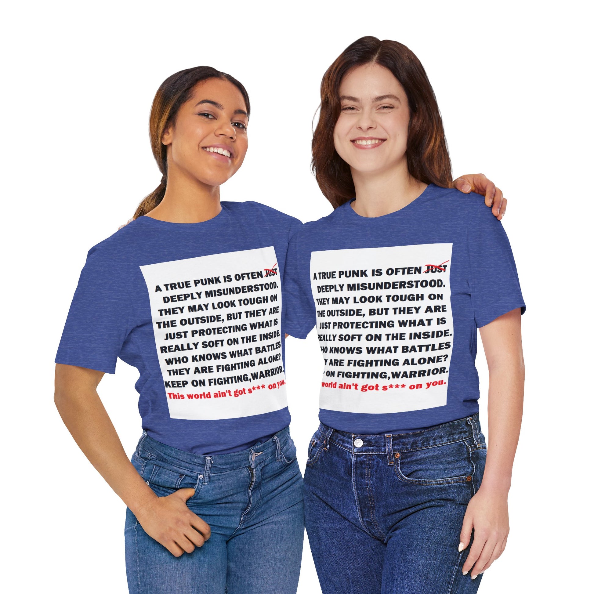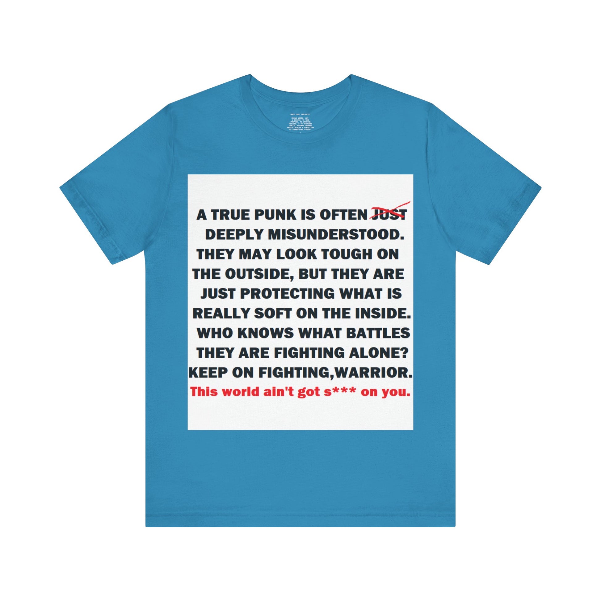 "A TRUE PUNK IS OFTEN JUST DEEPLY MISUNDERSTOOD. THEY MAY LOOK TOUGH ON THE OUTSIDE, BUT THEY ARE JUST PROTECTING WHAT IS REALLY SOFT ON THE INSIDE. WHO KNOWS WHAT BATTLES THEY MAY BE FIGHTING ALONE? KEEP ON FIGHTING, WARRIOR. This world ain't got s*** on you."