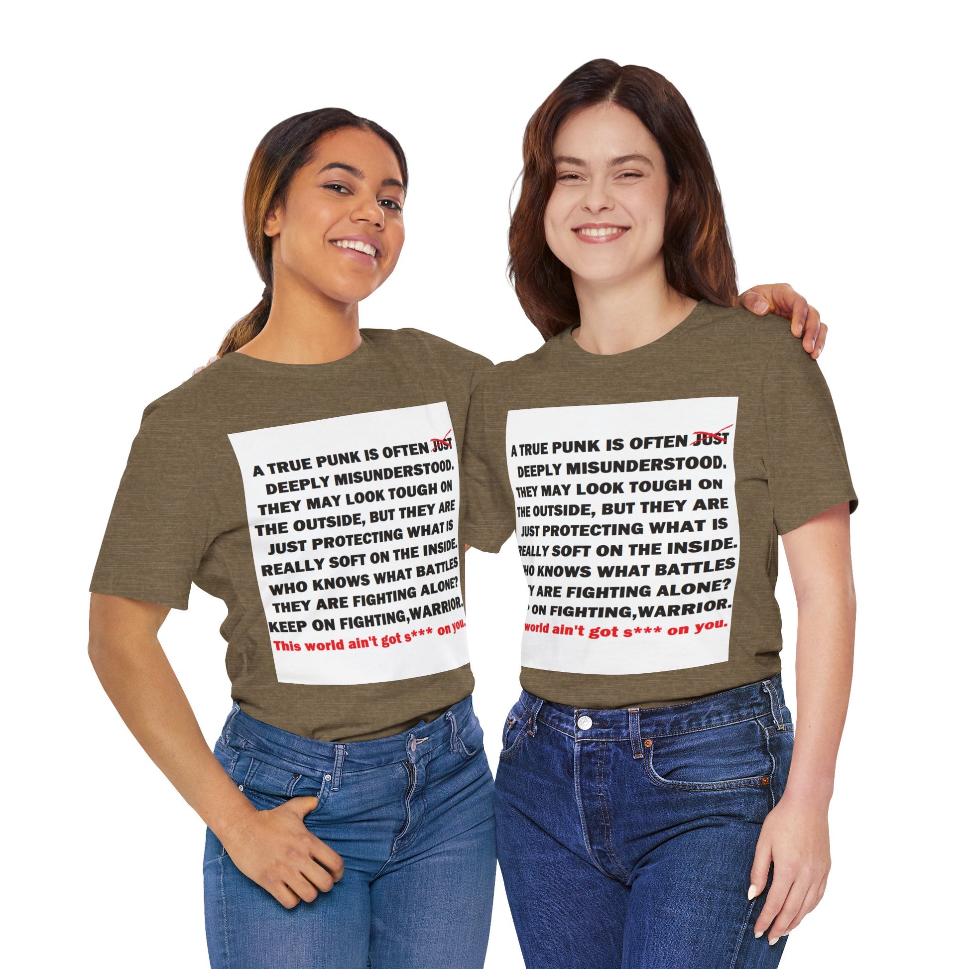 "A TRUE PUNK IS OFTEN JUST MISUNDERSTOOD. THEY MAY LOOK TOUGH ON THE OUTSIDE, BUT THEY ARE JUST PROTECTING WHAT IS REALLY SOFT ON THE INSIDE. WHO KNOWS WHAT BATTLES THEY ARE FIGHTING ALONE? KEEP ON FIGHTING, WARRIOR. This world ain't got s*** on you."